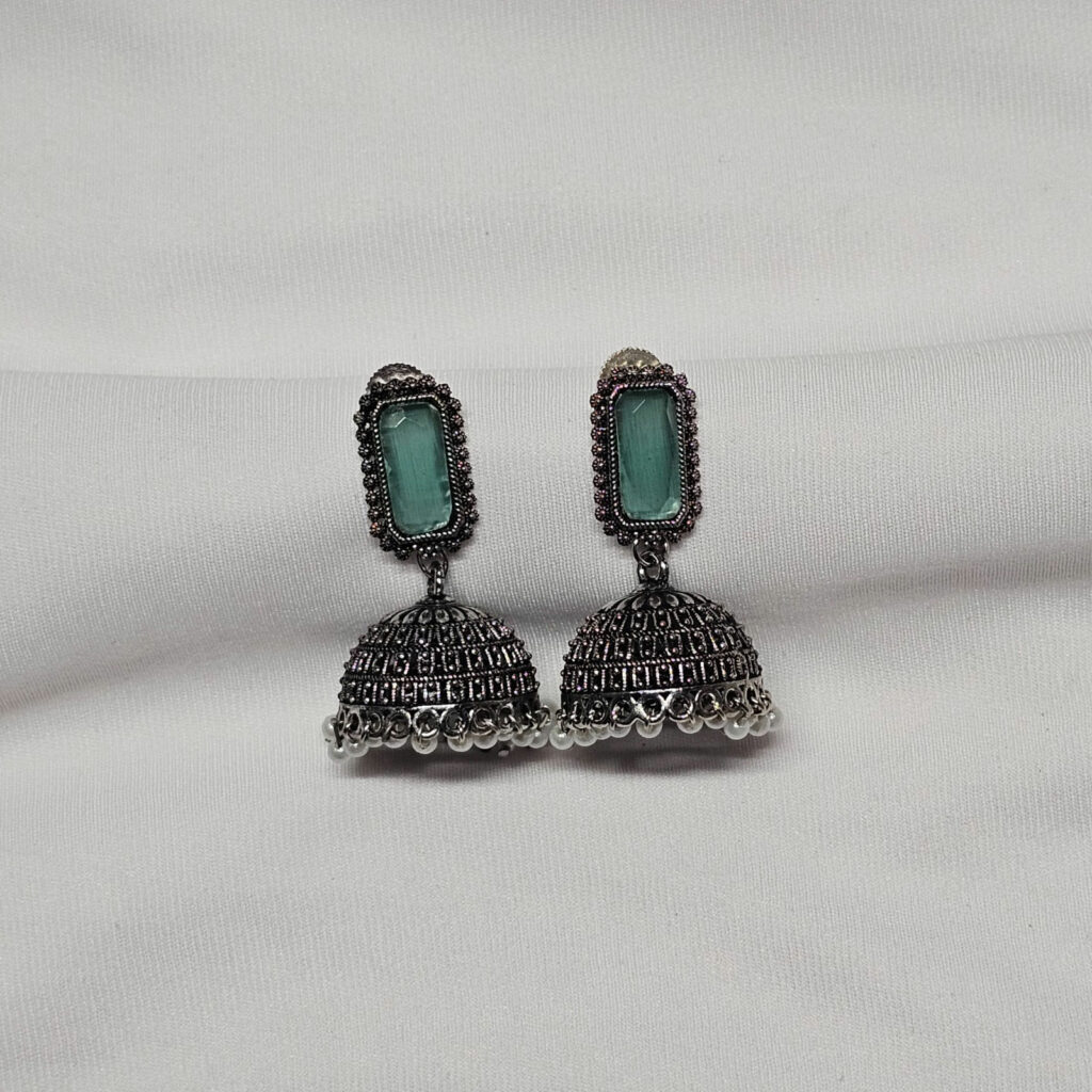 The Anaya earrings are a delicate embodiment of elegance and simplicity. These minimal jhumkas are adorned with rectangular stones, adding a subtle yet striking touch to any ensemble.