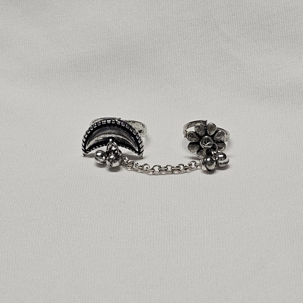 Chandni, meaning “moonlight,” beautifully captures the essence of the half moon and flower design in this unique double ring. Wearable on one finger, it symbolizes the harmony of nature and elegance.