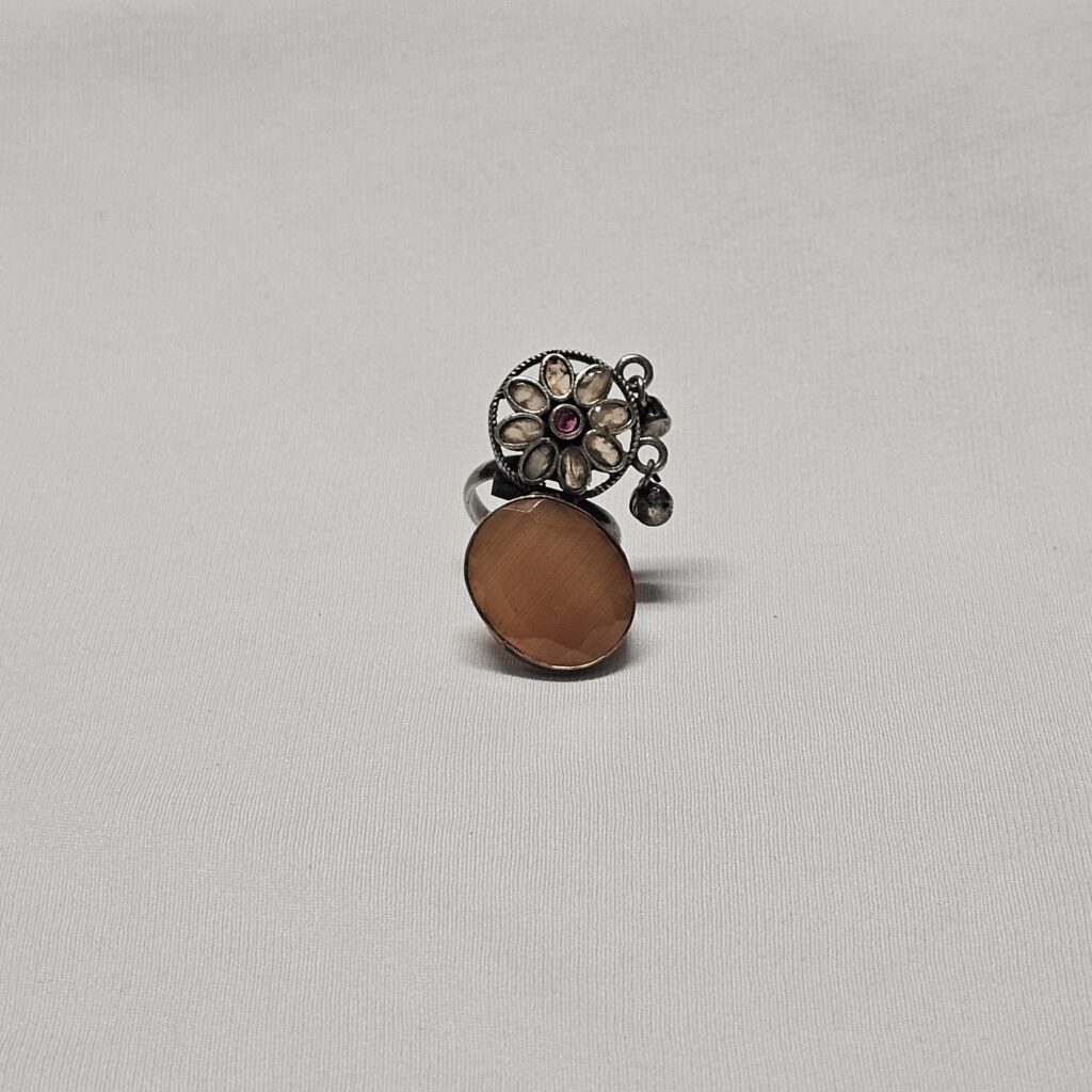 Citrika, inspired by the warm glow of citrine, features a beautifully carved flower design with an elegant stone. The large orange stone adds a radiant touch, making this ring a statement piece for any occasion.