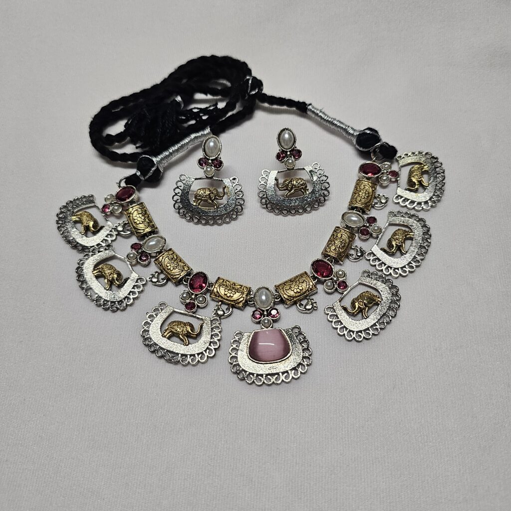 Gajraj, meaning “king of elephants,” showcases the majestic beauty of this neckpiece. The detailed carvings feature elegant elephants and peacocks, adorned with a blend of silver and gold tones, beads, and stones, creating a look that is both regal and unique.