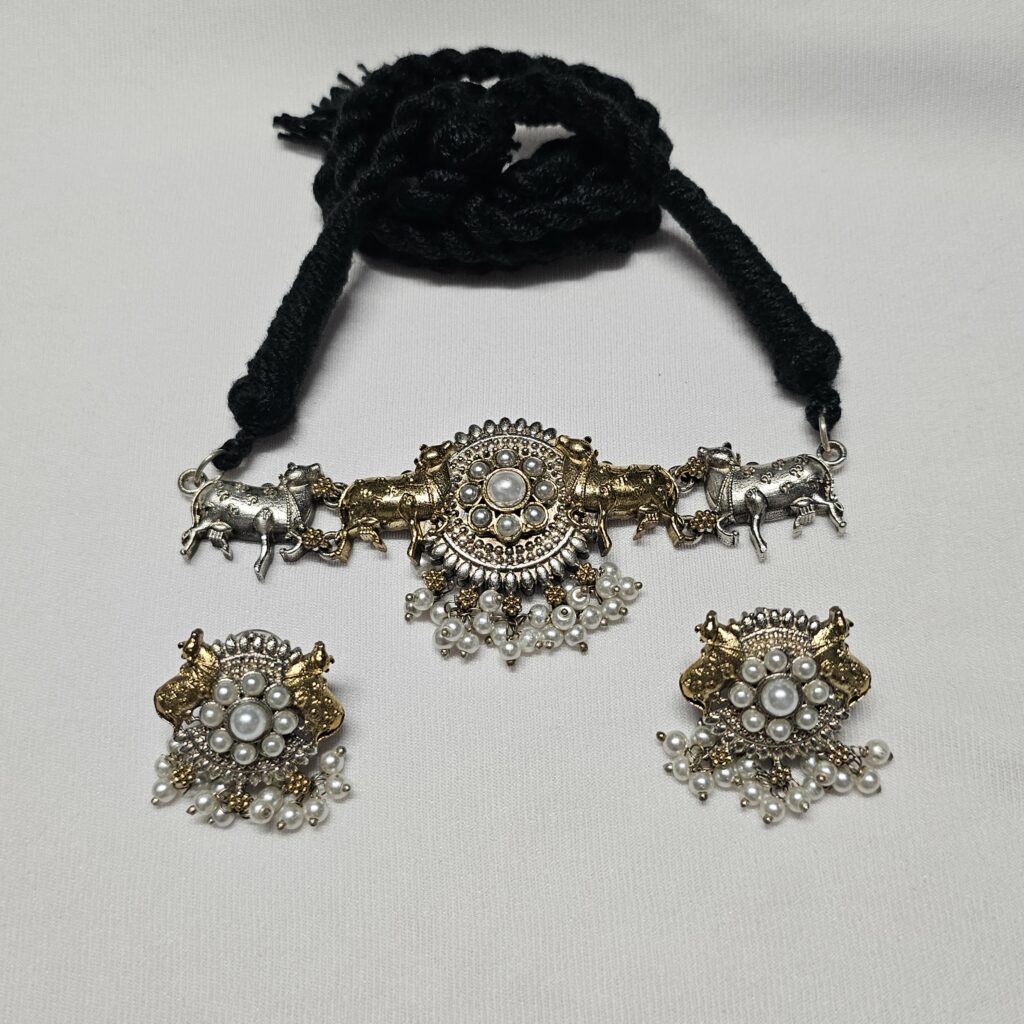 Gauhar, meaning “precious stone,” represents the intricate beauty and elegance of this choker. The detailed carvings and unique cow embellishments, combined with delicate beads, create a look that is both classy and royal.