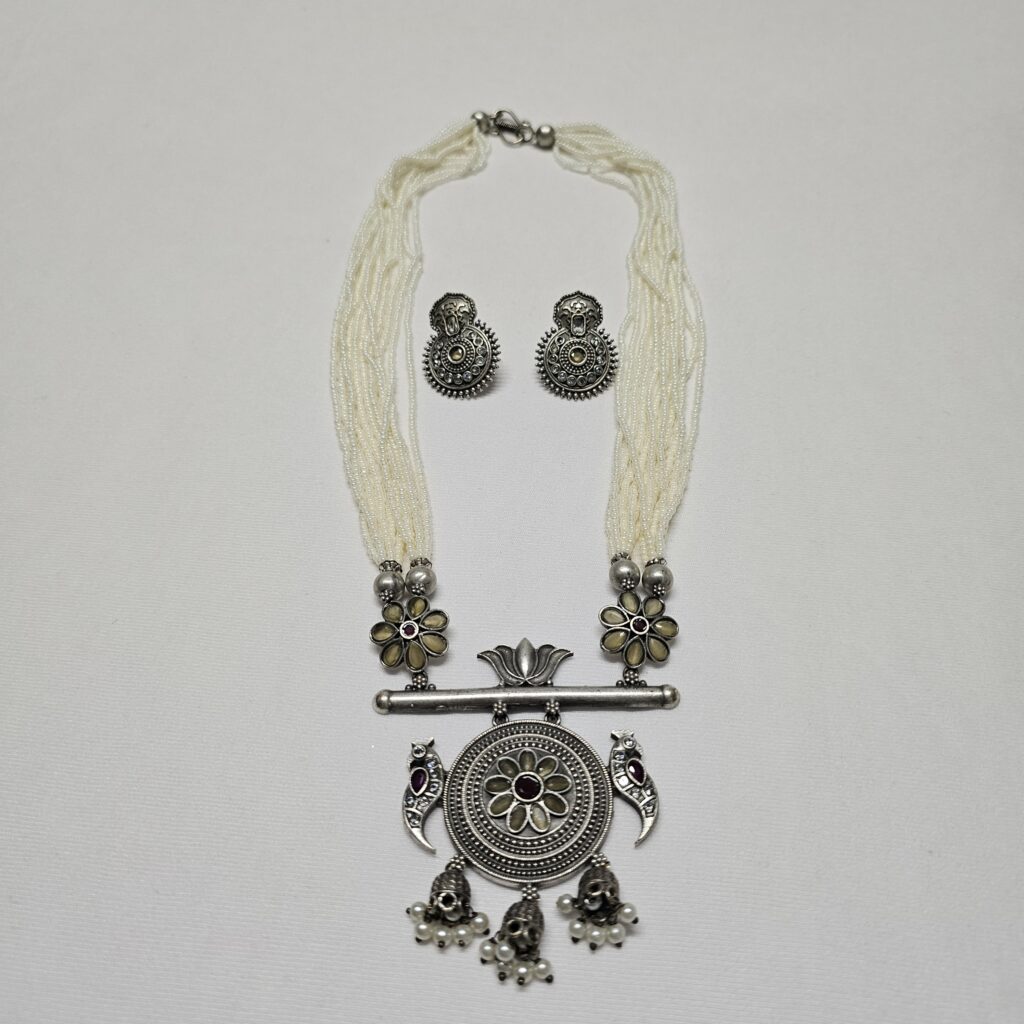 Kamini, meaning “desirable,” signifies beauty and elegance. This limited edition necklace features a beaded mala with a central chakra-style carved round piece and a lotus motif above, representing purity and grace.