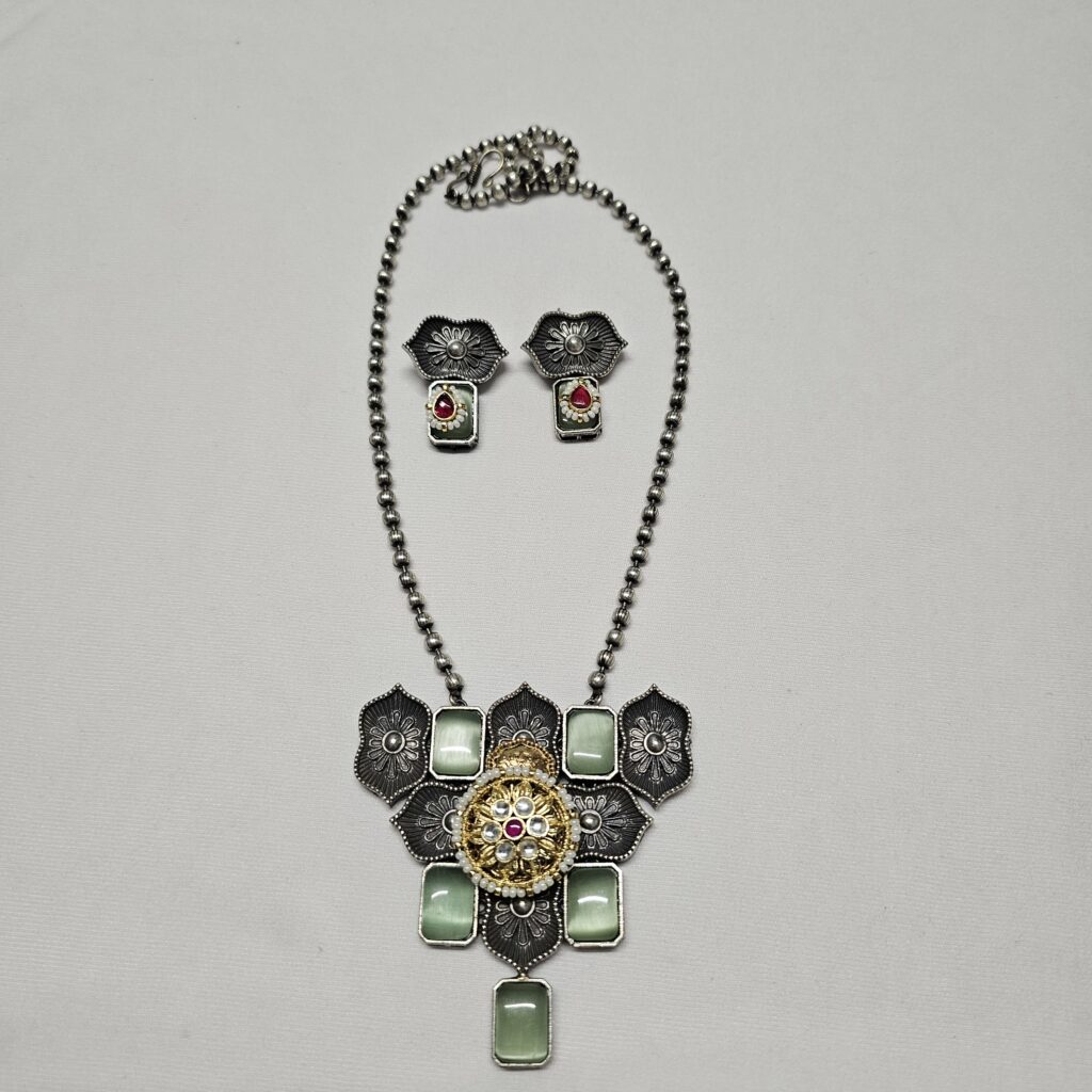 Kanak, meaning “gold,” signifies richness and beauty. This long necklace features detailed flower carvings adorned with stones and a central Jadtar charm, embodying elegance and tradition. It comes with matching earrings to complete the look.