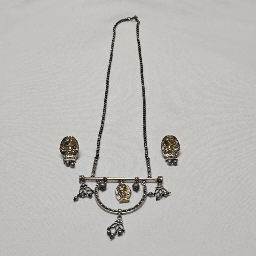 Lajwanti, meaning “shy and delicate,” embodies the subtle elegance and charm of this unique necklace. The minimalistic design features ancient doll carvings with a golden tone and hanging ghoogri balls, accompanied by matching earrings, creating a perfect blend of tradition and sophistication.