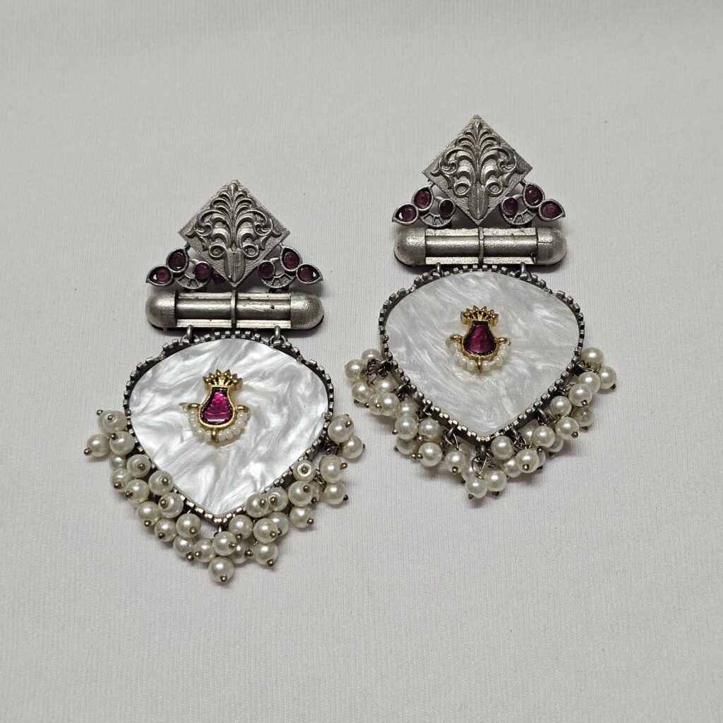 Manorama, meaning “beautiful to the mind,” captures the exquisite elegance of these earrings. Featuring detailed carvings on the top, adorned with the luminous Nacre stone (Mother of Pearl) and Jadtar, these earrings are finished with delicate beads hanging at the bottom, making them a stunning addition to your collection.