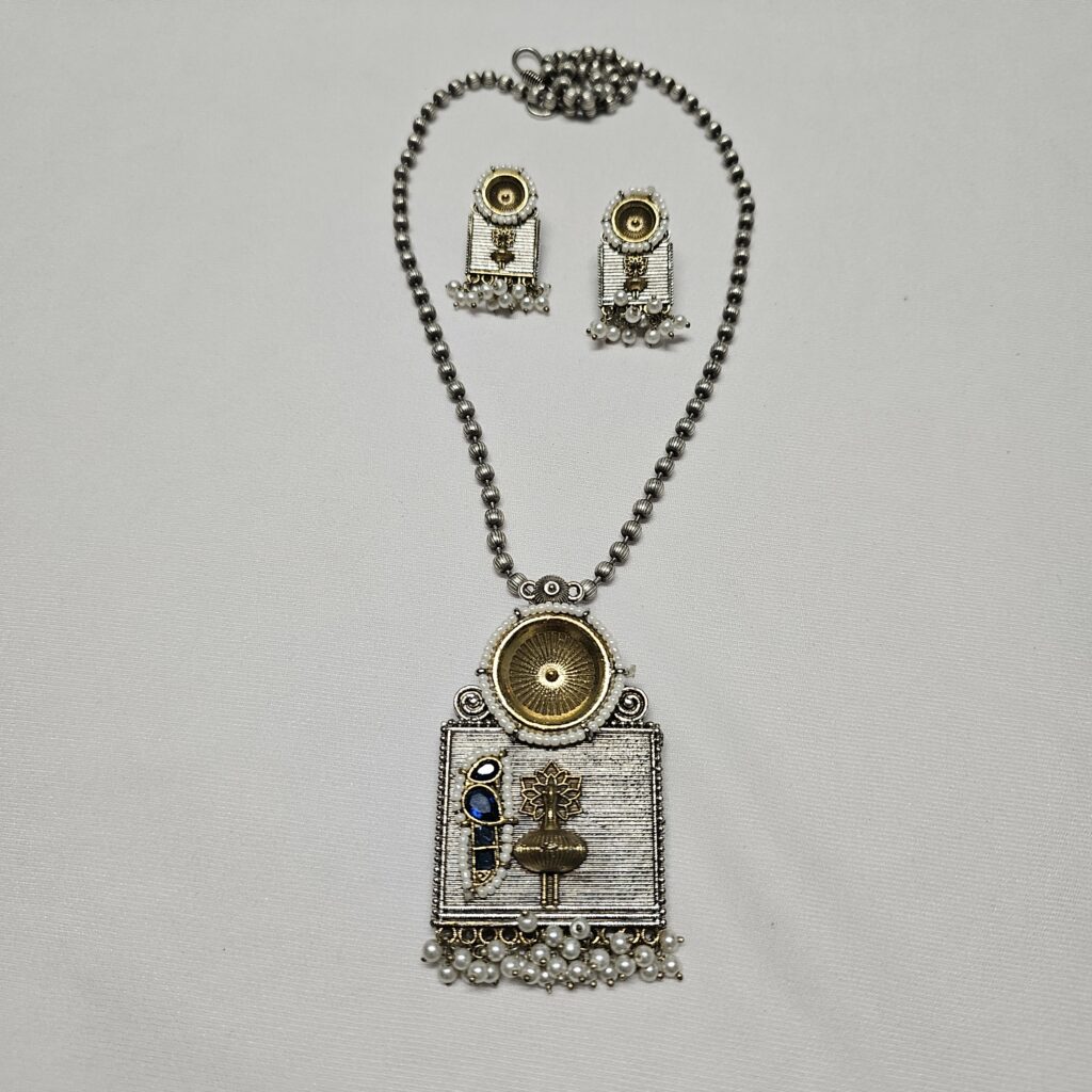 Mayuri, meaning “peacock,” reflects the grace and beauty of this majestic bird. This necklace features a square embellishment with a carved peacock, accented with a stone on the side and hanging beads at the bottom, embodying elegance and traditional craftsmanship.