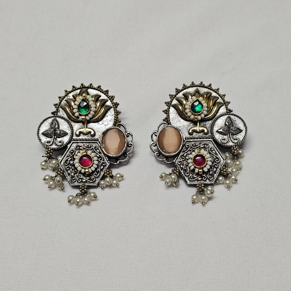 Rajani, meaning “queenly,” embodies regal elegance and grace. These earrings feature an open lotus design with a sunrise motif, a hexagon shape at the bottom adorned with Jadtar, and minimal beads, creating a look fit for royalty.