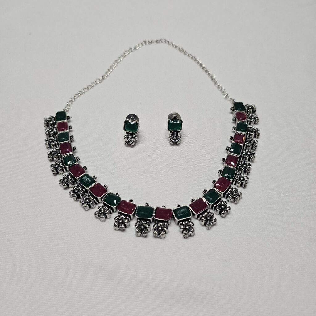 Riddhi, meaning “prosperity,” embodies elegance and charm. This necklace features small square stones set in detailed molds, complemented by little flower charms hanging at the bottom, creating a perfect blend of traditional and modern design.