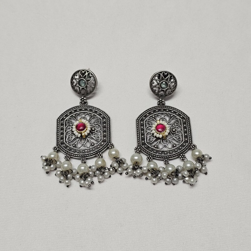 Sanchita, meaning “collection,” signifies the elegance of traditional artistry. These hexagon-shaped earrings are adorned with detailed carvings, big and small hanging beads, and a touch of Jadtar, offering a refined and sophisticated look.