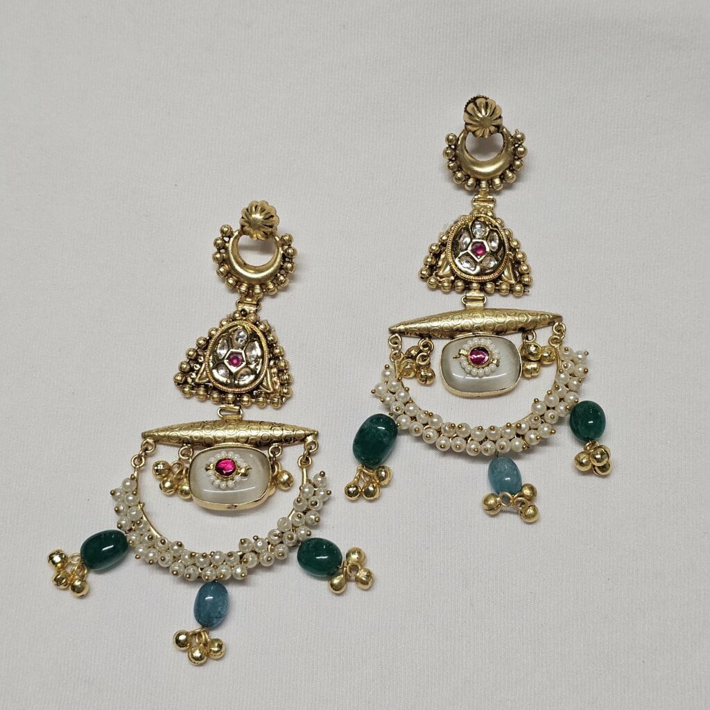 Shubhra, meaning “pure,” reflects the pristine and elegant nature of these long chandbali earrings. Coated in gold polish and adorned with Jadtar and stones, these earrings are not only visually stunning but also lightweight, making them comfortable to wear despite their length.