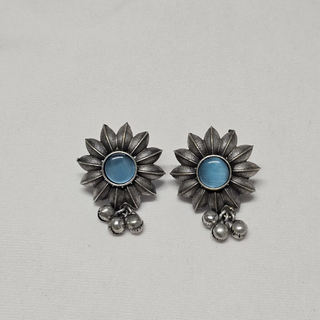 Suryanshi, meaning “part of the sun,” captures the essence of sunlight and warmth. These earrings, crafted in the style of a sunflower, feature a central stone and ghooghris at the bottom, radiating elegance and charm.