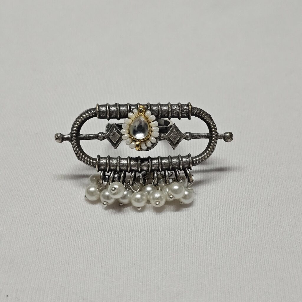 The Taran ring exudes elegance with its unique cylindrical shape, adorned by a jadtar charm at its center. The delicate beads hanging gracefully from the ring add an extra touch of sophistication, making it a perfect accessory for any occasion.
