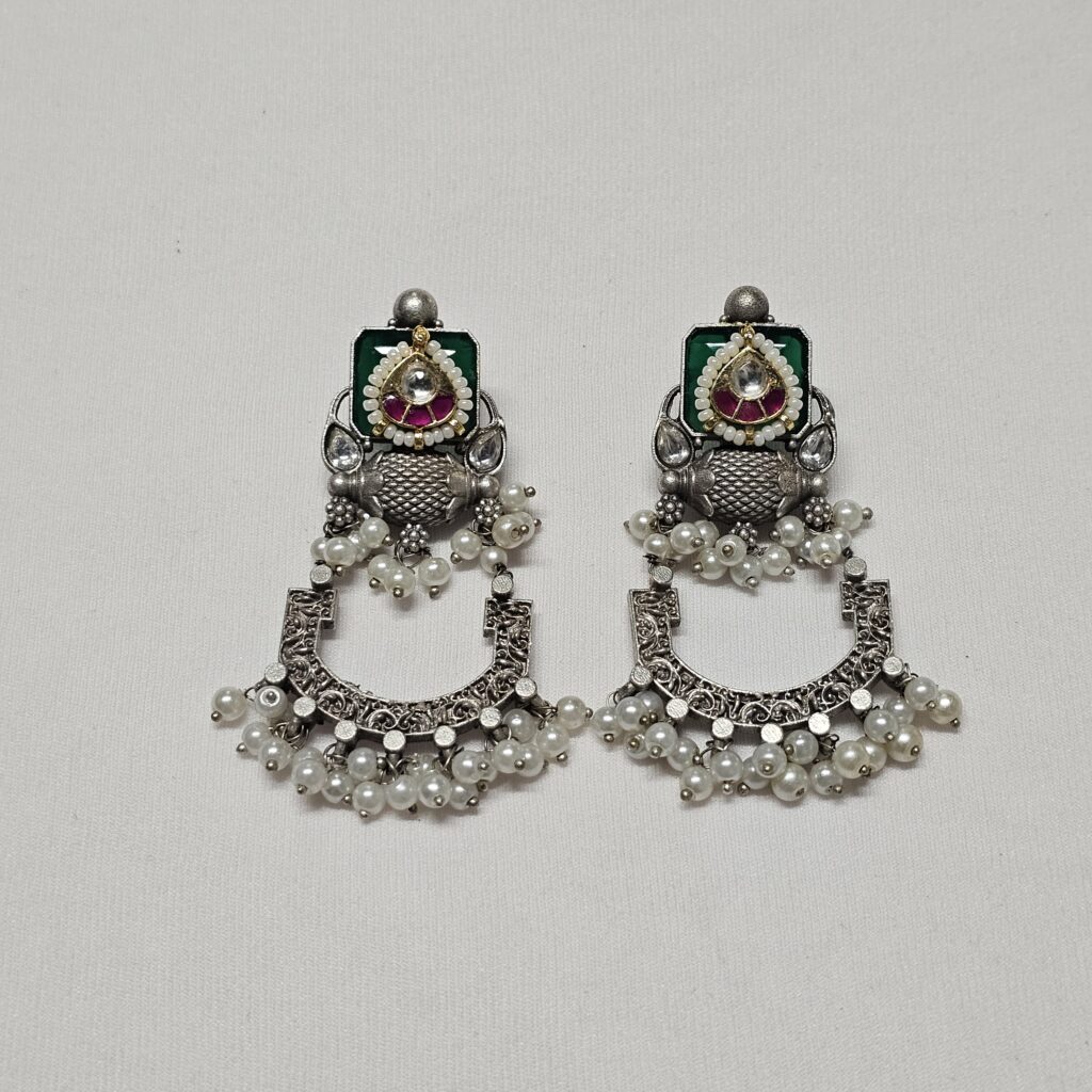 Tarangini, meaning “flowing like waves,” symbolizes the graceful and intricate design of these earrings. The detailed carvings reflect exceptional craftsmanship, while the addition of small beads and Jadtar stones enhances their elegance and grace.