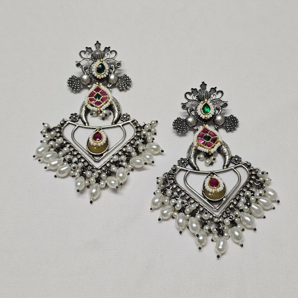 Tarinie, meaning “savior,” symbolizes protection and grace. These lightweight, long earrings feature a modern touch with Jadtar stones, a petal leaf design at the bottom, and detailed peacock carvings at the top, blending traditional and contemporary aesthetics perfectly.